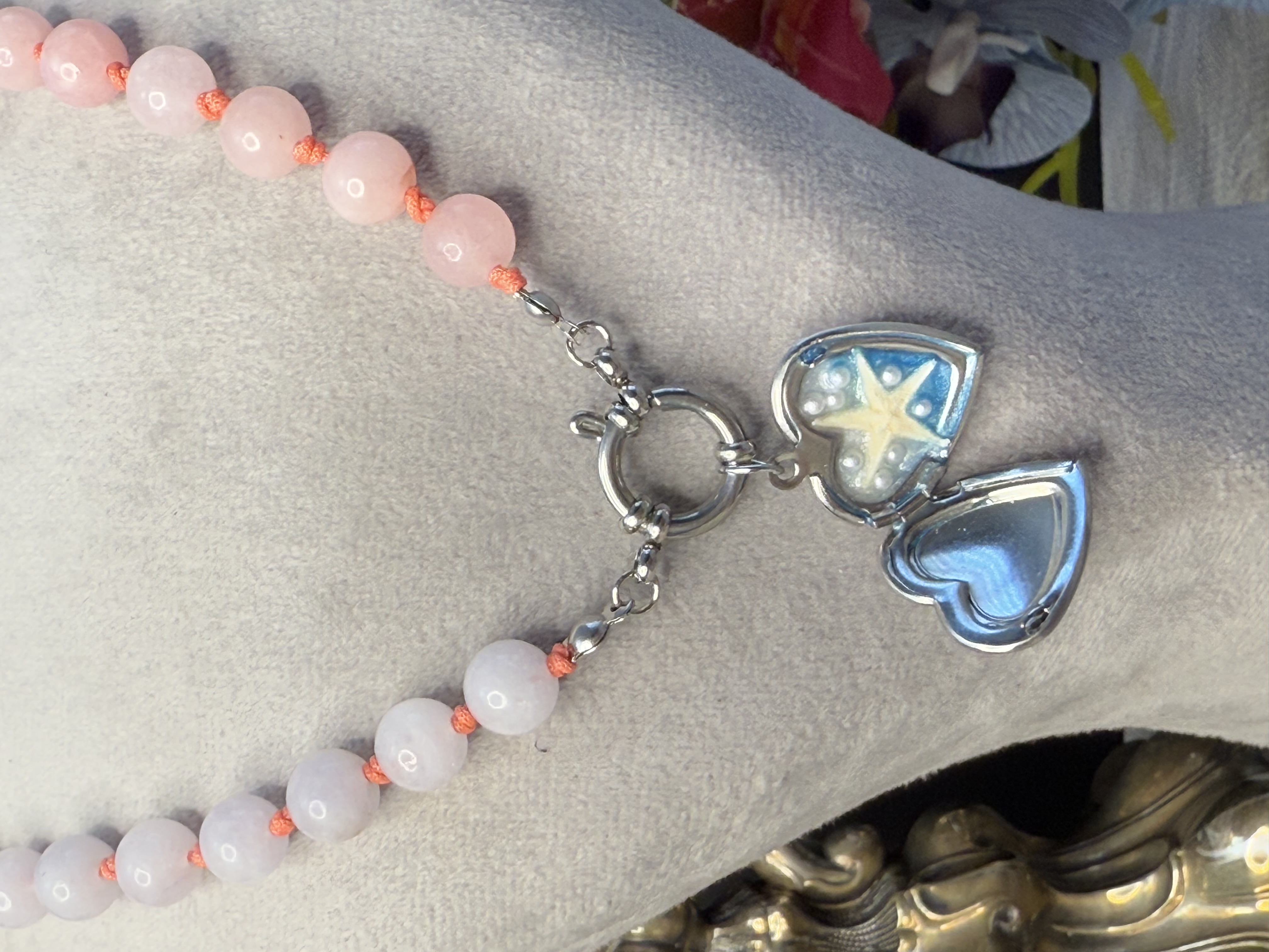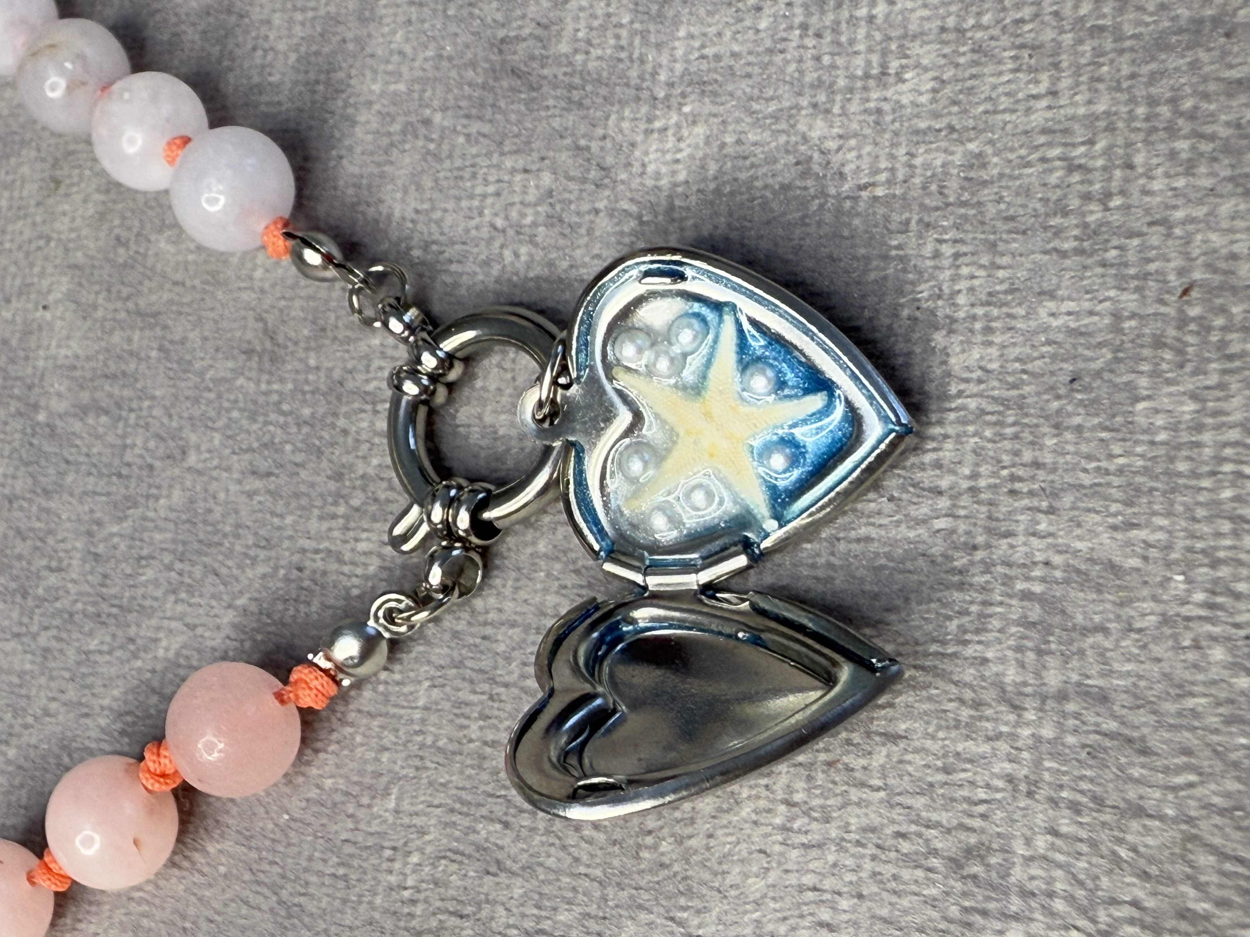 آویز : لاکت استیل قلبی با رزین شفاف، ستاره دریایی طبیعی و مروارید