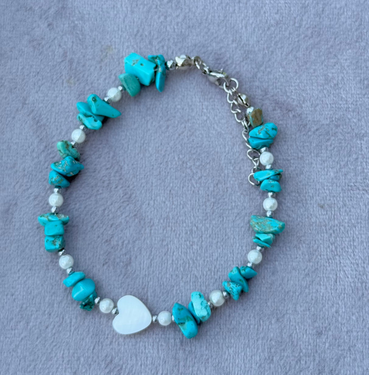 دستبند زنانه با ترکیب سنگ فیروزه، مروارید و قلب صدفی، جلوهای آرامشبخش و جذاب به استایل شما میبخشد. طراحی مینیمال و دستساز، هر قطعه را منحصر به فرد و خاص میکند و حس طبیعت و لطافت را منتقل میکند.
