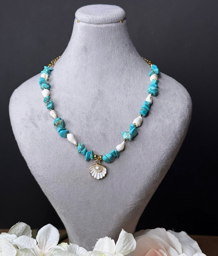 گردنبند زنانه سنگ فیروزه و صدف، طراحیای آرامشبخش و شیک دارد که با ترکیب سنگهای فیروزه طبیعی و صدف ساخته شده است. این ترکیب رنگی حس طراوت و انرژی مثبت را به استایل شما اضافه میکند و جلوهای منحصربهفرد ایجاد میکند.