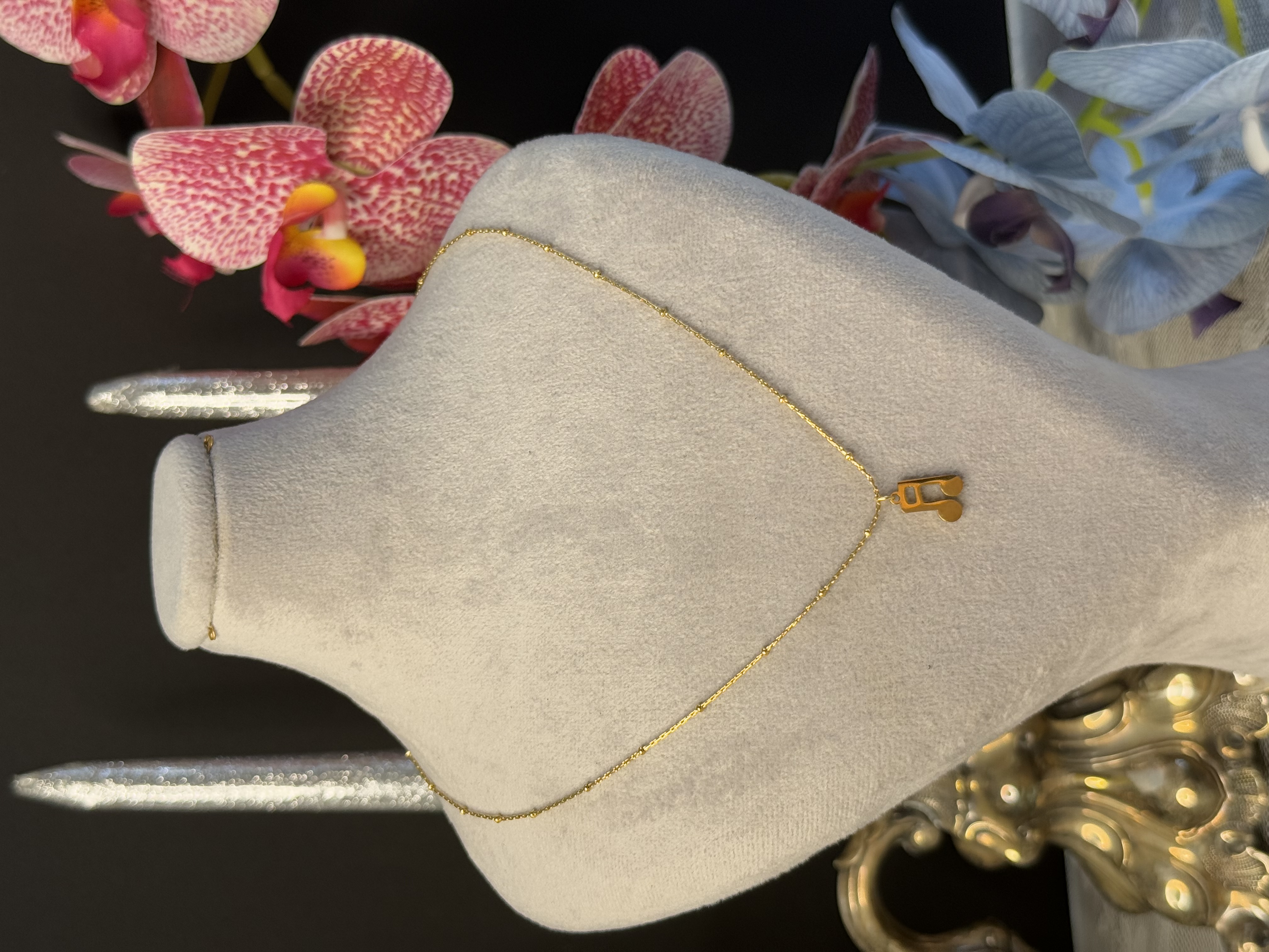 پلاک موزیک از استیل ضد زنگ و ضد حساسیت ساخته شده و دوام بالایی در برابر تغییر رنگ دارد. زنجیر توپی طلایی باکیفیت و مقاوم است و طراحی دستساز گردنبند، جلوهای منحصربهفرد به آن بخشیده است.