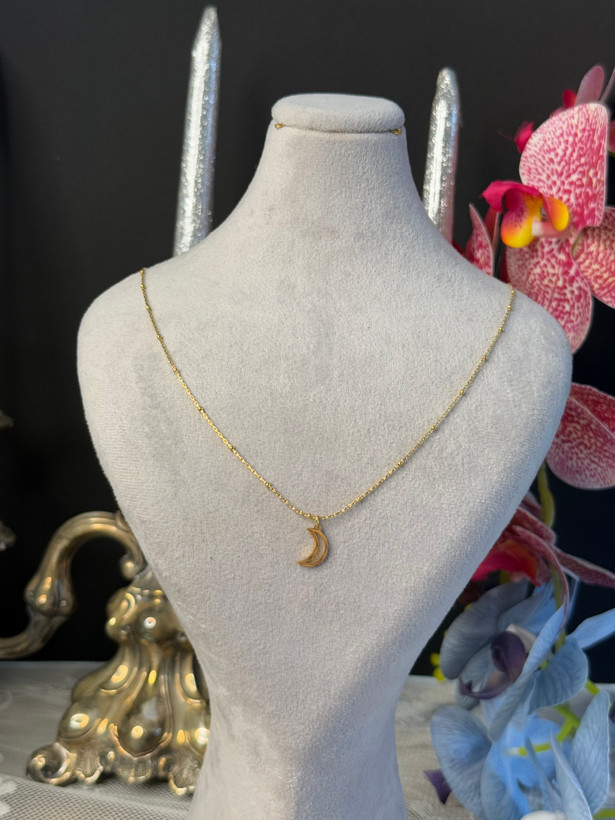 پلاک ماه از استیل ضد زنگ و ضد حساسیت ساخته شده و دوام بالایی در برابر تغییر رنگ دارد. زنجیر توپی طلایی باکیفیت و مقاوم است و طراحی دستساز گردنبند، جلوهای منحصربهفرد به آن بخشیده است.
