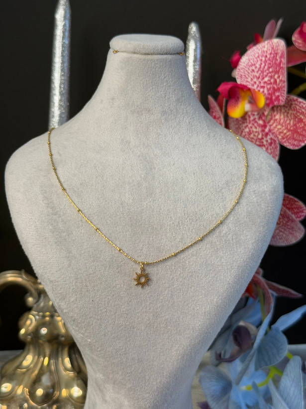 پلاک خورشید کوچک از استیل ضد زنگ و ضد حساسیت ساخته شده و دوام بالایی در برابر تغییر رنگ دارد. زنجیر توپی طلایی باکیفیت و مقاوم است و طراحی دستساز گردنبند، جلوهای منحصربهفرد به آن بخشیده است.