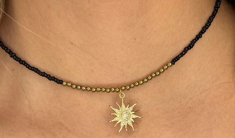 گردنبند زنانه منجوق مشکی و آویز خورشید طلایی