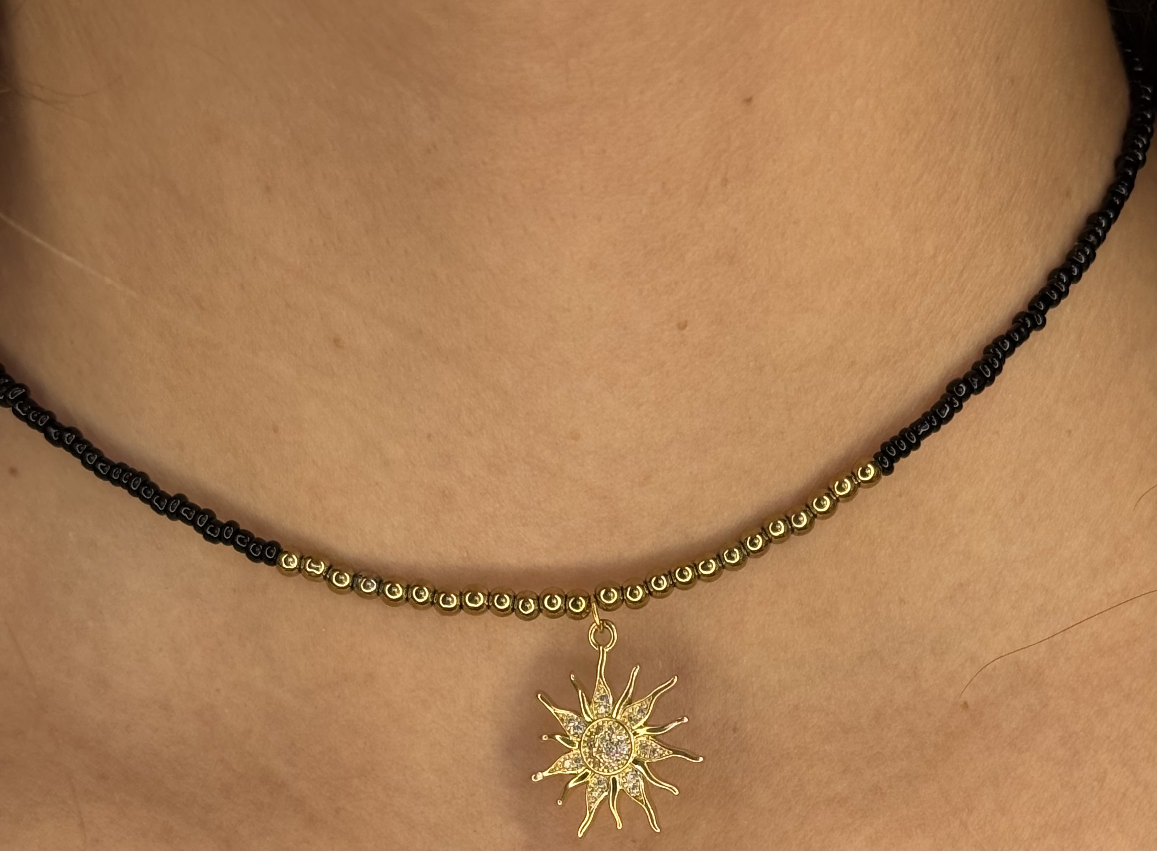 گردنبند زنانه منجوق مشکی و آویز خورشید طلایی