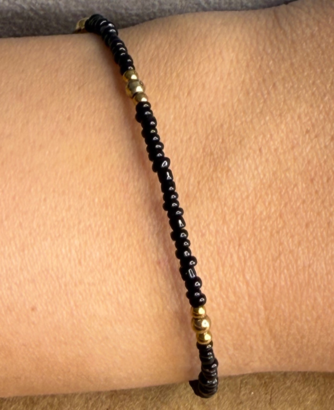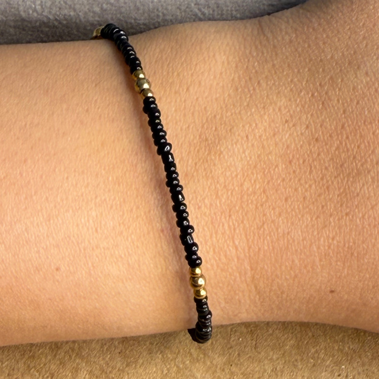 دستبند منجوق مشکی و گوی طلایی، ترکیبی ساده و درعینحال شیک است که میتواند بهراحتی با هر استایلی ست شود. منجوقهای مشکی براق در کنار گوی طلایی رنگ، جلوهای ظریف و چشمگیر به این دستبند بخشیدهاند.